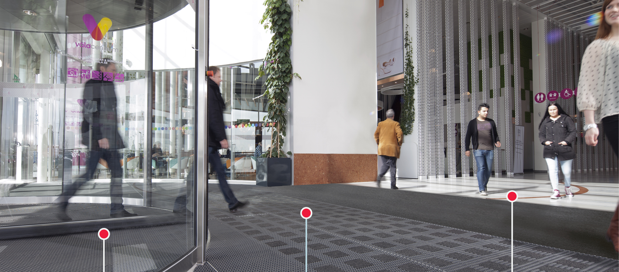 TRAFIKKSONE Den siste sonen danner en overgang mellom selve entreen og for eksempel resepsjon, heis eller trapper. Her fjernes de siste restene av eventuelt smuss fra utsiden av bygningen. Trafikksonen må takle stor trafikk. Dette er ekstra viktig i nordisk klima med mye smuss og slaps store deler av året. |